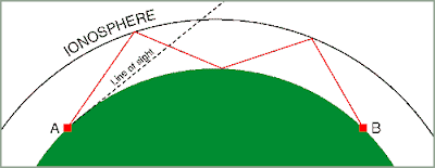 Esquema de la utilización de la ionosfera como parte emisora de rayos energéticos emitidos desde tierra